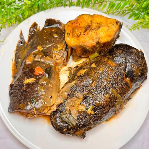 Catfish is a popular fish in Nigerian cuisine, known for its firm, tender flesh and distinct, mild flavor. it is typically seasoned with spices, herbs, and sometimes palm oil. The fish is either grilled, fried, or boiled, and is commonly paired with rice, yam, or plantains, offering a nutritious and delicious addition to meals.