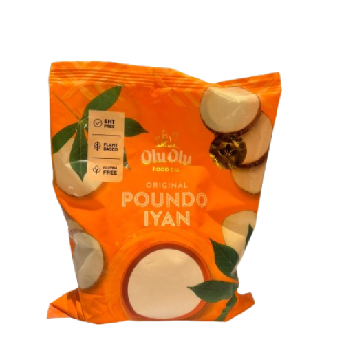 Olu Olu Poundo yam is a popular West African dish made from yam flour, also known as instant pounded yam flour. This flour is a convenient alternative to traditional pounded yam, which is made by boiling and pounding fresh yams. To prepare poundo yam, the yam flour is simply stirred into hot water, creating a smooth, stretchy, and fluffy dough-like consistency. This dish is known for its mild, slightly sweet flavor and is often served as a staple side with a variety of soups and stews, such as egusi or ogbono soup. Poundo yam is a quick and easy way to enjoy the traditional taste and texture of pounded yam with less preparation time.